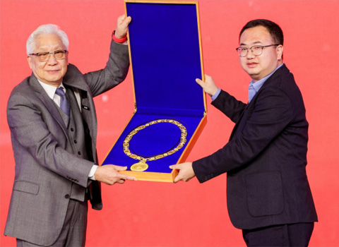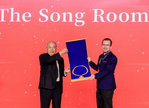 徐万茂(左)为第二届华茂美堉奖国际获奖团体The Song Room(右为代表谭本恩)颁奖